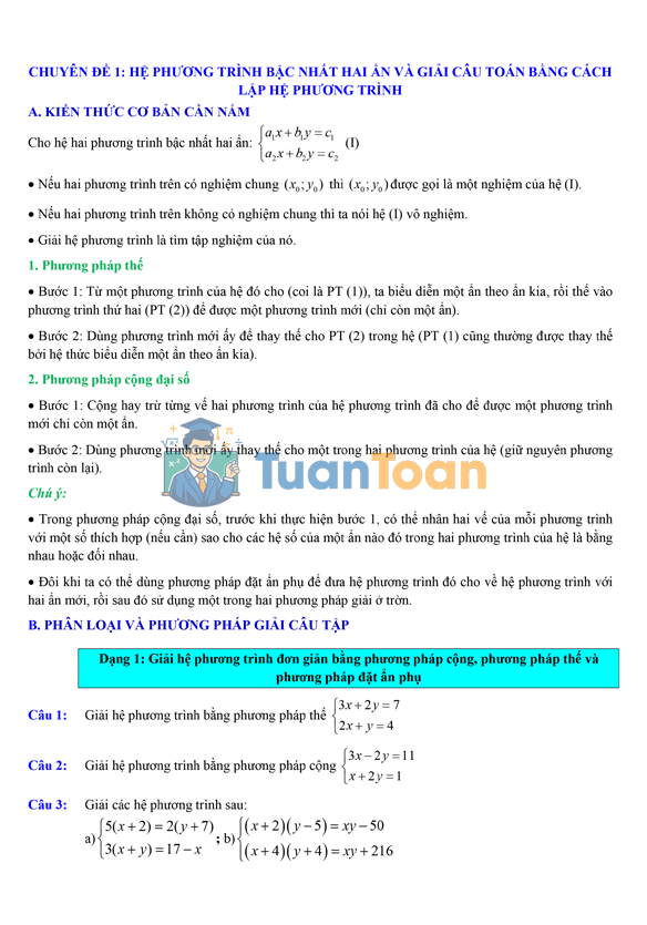TuanToan.com giới thiệu đến quý thầy cô và các em học sinh tài liệu chuyên đề hệ phương trình bậc nhất hai ẩn và giải bài toán bằng cách lập hệ phương trình.
