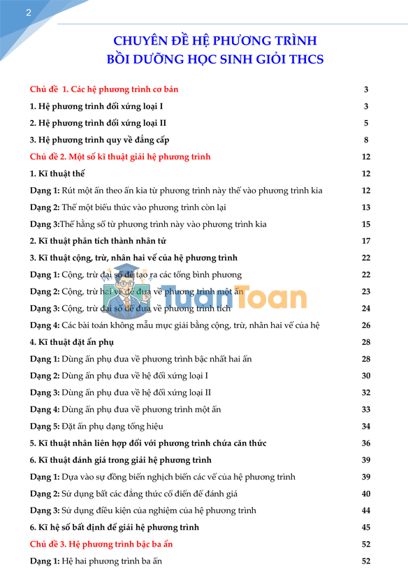 Tài liệu cung cấp đầy đủ các dạng hệ phương trình từ cơ bản đến nâng cao, kèm theo nhiều kỹ thuật giải quan trọng thường gặp trong các kỳ thi học sinh giỏi. Việc luyện tập theo từng chuyên đề sẽ giúp học sinh phát triển tư duy linh hoạt và nâng cao khả năng xử lý bài toán khó. Đây là tài liệu hữu ích mà TuanToan.com dành cho học sinh muốn chinh phục các bài toán hệ phương trình ở mức độ cao.