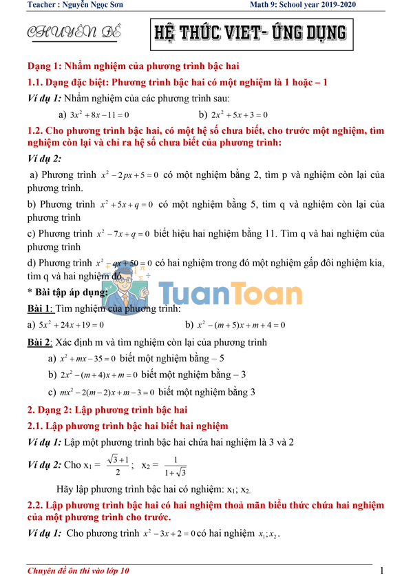 TuanToan.com giới thiệu đến quý thầy cô và các em học sinh lớp 9 tài liệu chuyên đề hệ thức Vi-ét do thầy Nguyễn Ngọc Sơn biên soạn. Đây là một nội dung trọng tâm trong chương trình Đại số 9, thường xuyên xuất hiện trong các đề thi vào lớp 10, giúp học sinh giải nhanh phương trình và xử lý các bài toán liên quan đến nghiệm.