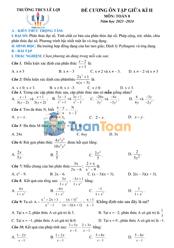TuanToan.com giới thiệu đến quý thầy cô và các em học sinh đề cương ôn tập giữa học kì 2 môn Toán lớp 8 năm học 2023 – 2024 của trường THCS Lê Lợi, quận Hà Đông, thành phố Hà Nội.