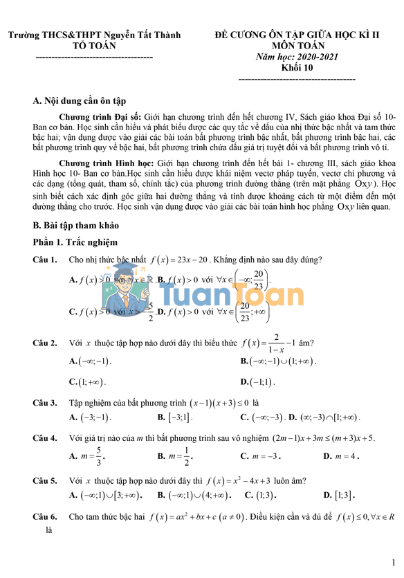 Đề cương Toán 10 giữa HK2 – Nguyễn Tất Thành, Hà Nội (2020 – 2021)