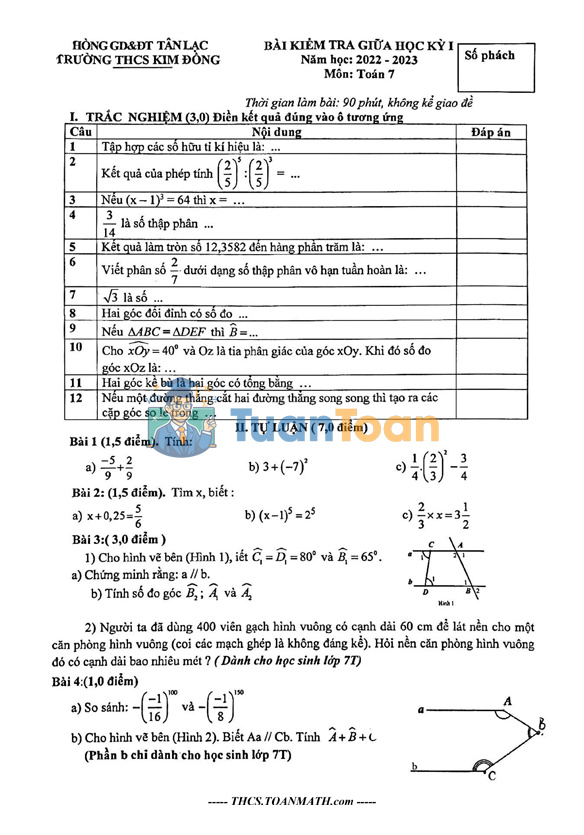 TuanToan.Com trân trọng giới thiệu đến quý thầy, cô giáo và các em học sinh lớp 7 đề kiểm tra giữa học kỳ 1 môn Toán 7 năm học 2022 – 2023 của Trường THCS Kim Đồng, huyện Tân Lạc, tỉnh Hòa Bình. Đề thi được biên soạn bám sát chương trình Toán 7, đảm bảo đánh giá toàn diện kiến thức và kỹ năng của học sinh sau nửa đầu học kỳ 1.