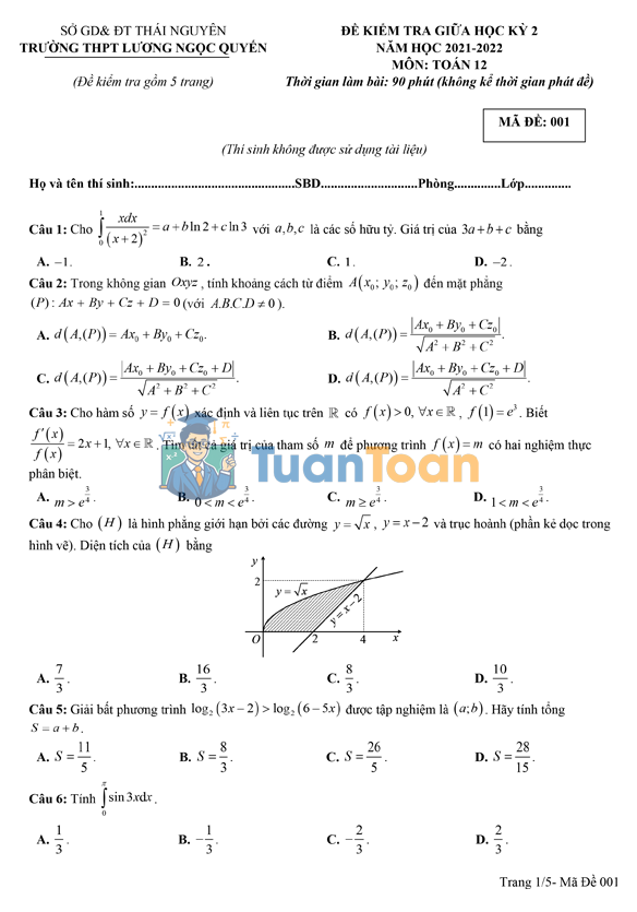 TuanToan.com giới thiệu đến bạn đề kiểm tra chất lượng giữa học kì 2 môn Toán 12 năm học 2021 – 2022 trường THPT Lương Ngọc Quyến – Thái Nguyên, kèm đáp án mã đề 001, rất phù hợp để luyện tập trong giai đoạn này.