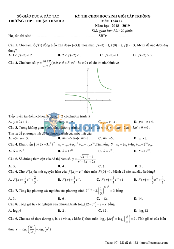 TuanToan.Com trân trọng giới thiệu đến quý thầy, cô giáo và các em học sinh đề thi chọn học sinh giỏi môn Toán 12 cấp trường năm học 2018 – 2019 của Trường THPT Thuận Thành 2, tỉnh Bắc Ninh.