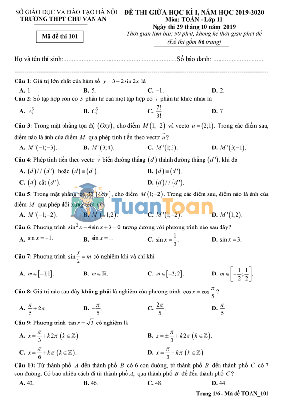 Tại TuanToan.com, chúng tôi luôn nỗ lực mang đến những đề thi chất lượng cao từ các trường THPT uy tín trên cả nước. Dưới đây là đề kiểm tra giữa học kỳ 1 môn Toán 11 năm học 2019 – 2020 của trường THPT Chu Văn An (Hà Nội) – tài liệu hữu ích giúp học sinh luyện tập và nâng cao kỹ năng làm bài.