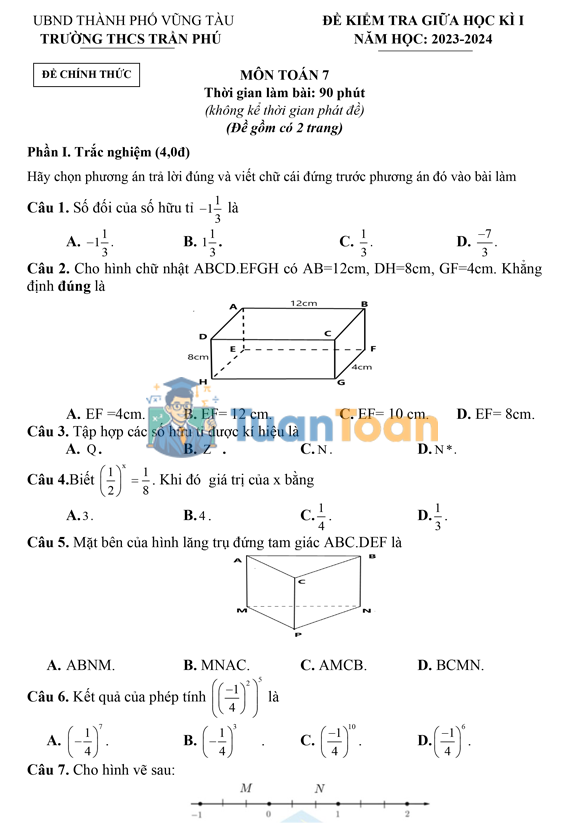 Đề thi giữa HK1 Toán lớp 7 năm 2023–2024 trường Trần Phú (Bà Rịa – Vũng Tàu)