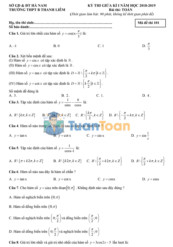 Trong quá trình ôn tập môn Toán lớp 11, việc luyện tập với các đề thi trắc nghiệm giúp học sinh làm quen với cấu trúc đề và nâng cao tốc độ xử lý bài toán. Nhằm hỗ trợ hiệu quả cho việc học tập, TuanToan.Com giới thiệu đề thi giữa kì 1 môn Toán 11 năm học 2018 – 2019 Trường THPT B Thanh Liêm – Hà Nam (mã đề 101).