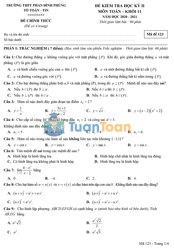 TuanToan.com trân trọng giới thiệu đến quý thầy cô và các em học sinh đề thi học kì 2 môn Toán lớp 11 năm học 2020 – 2021 của trường THPT Phan Đình Phùng – Hà Nội. Đây là đề thi có cấu trúc chuẩn, bám sát chương trình học và phù hợp để ôn luyện trước các kỳ kiểm tra quan trọng.