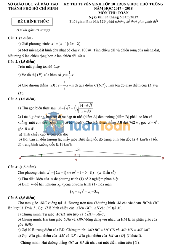 Đề thi tuyển sinh vào lớp 10 môn Toán năm 2017 – 2018 – Sở GD&ĐT TP.HCM
