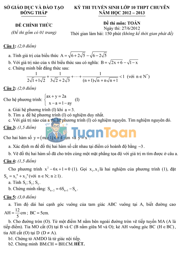 TuanToan.com luôn nỗ lực sưu tầm và chia sẻ những đề thi chất lượng nhằm hỗ trợ quý thầy cô và các em học sinh trong quá trình dạy – học và ôn luyện. Trong bài viết này, TuanToan.com gửi đến bạn đọc đề thi tuyển sinh vào lớp 10 chuyên môn Toán năm học 2012 – 2013 của Sở Giáo dục và Đào tạo tỉnh Đồng Tháp. Đây là đề thi có độ phân hóa cao, phù hợp để luyện tập và nâng cao năng lực giải toán cho học sinh khá, giỏi.