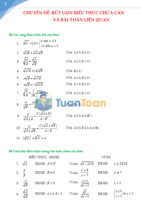 TuanToan.com trân trọng giới thiệu đến quý thầy cô và các em học sinh tài liệu gồm 91 trang, được sưu tầm và tổng hợp bởi tác giả Trịnh Bình. Nội dung tài liệu tập trung vào chuyên đề rút gọn biểu thức chứa căn và các dạng toán liên quan – một phần kiến thức quan trọng, xuất hiện thường xuyên trong chương trình Toán 9 cũng như đề thi tuyển sinh vào lớp 10.