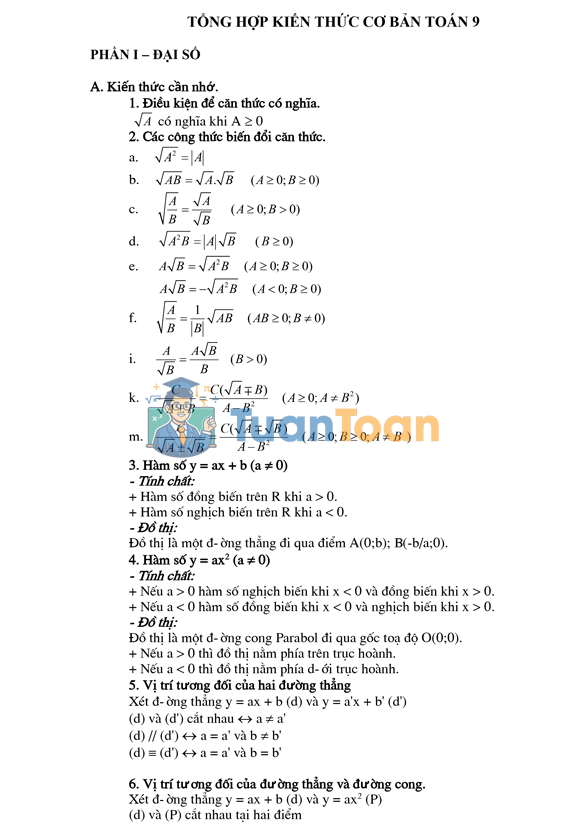 TuanToan.com giới thiệu đến các em học sinh tài liệu tổng hợp kiến thức cơ bản Toán 9 gồm 17 trang, được biên soạn ngắn gọn, dễ hiểu. Tài liệu bao gồm lý thuyết trọng tâm, các dạng toán tiêu biểu và phương pháp giải nhanh, giúp các em dễ dàng tra cứu và ôn tập hiệu quả, đặc biệt hữu ích trong quá trình chuẩn bị cho kỳ thi tuyển sinh vào lớp 10 môn Toán.