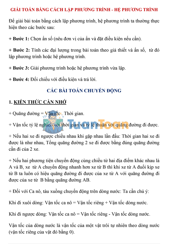 Trong quá trình học Toán 9, việc chuyển một bài toán thực tế về dạng phương trình hay hệ phương trình là kỹ năng quan trọng giúp học sinh giải quyết vấn đề một cách khoa học. TuanToan.com giới thiệu tài liệu 20 trang tổng hợp phương pháp và các dạng toán tiêu biểu, hỗ trợ học sinh ôn luyện hiệu quả và chuẩn bị tốt cho kỳ thi vào lớp 10.