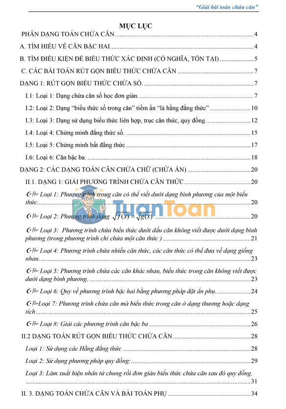 Tài liệu được xây dựng theo hướng phân dạng rõ ràng – dễ học – dễ áp dụng, giúp học sinh từng bước làm chủ các bài toán chứa căn.