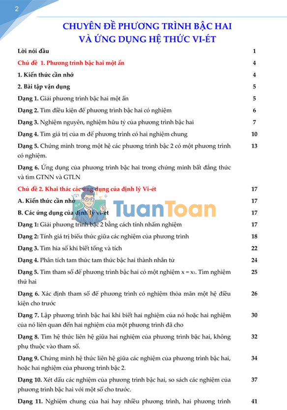 Phương trình bậc hai và hệ thức Vi-ét là một trong những nội dung trọng tâm của chương trình Đại số 9, xuất hiện với tần suất cao trong các đề thi vào lớp 10. Để giúp học sinh nắm chắc kiến thức và thành thạo các dạng bài, TuanToan.com giới thiệu tài liệu chuyên đề 101 trang do tác giả Trịnh Bình sưu tầm và tổng hợp, trình bày đầy đủ từ cơ bản đến nâng cao.
